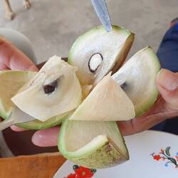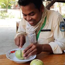 Frisch von dem neben uns stehenden, schattenspendenden Baum gibt es Milk-fruits. Die runde PLAE TEUK DOS schaut wie ein Apfel aus, schmeckt aber wie eine süße Birne.