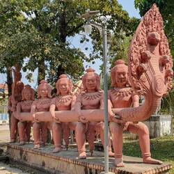 NEAK PEAN ist ein Tempel auf einer kleinen Insel. Eine 200 m lange Brücke bringt uns über ein geflutetes Areal. 2 verschlungene Naga-Schlagen ragen aus dem Wasser. Immer wieder begegnen uns Kambodschaner und heißen uns willkommen!