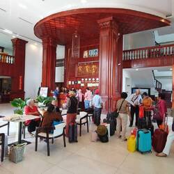 Schon in BANGKOK werden wir, ganz unauffällig mit einem Klebchen gekennzeichnet, aus der wartenden Menge gefischt und unauffällig zum Immigration-Officer geleitet. Wir sind etwas beunruhigt, zumal wir beim Online-Check-In die ReisepassNummern vertauscht hatten. Ist bei allen Kontrollen jedoch Niemanden aufgefallen!