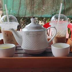 Es sind auch Mönche zugegen, ich werde zu einem 2. Frühstück eingeladen: Eiskaffee und eine Art "Königsberger Klops", nur ohne Kapern. Da kann ich nicht abschlagen, dann aber ab an den Fluß.