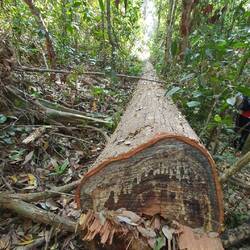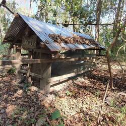 Plötzlich biegen wir auf einen Wanderpfad ab, es geht durch eine "Allee der Kautschukbäume"- dann stehen wir vor einer Hütte mitten im Wald.