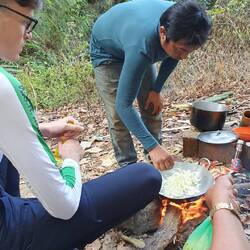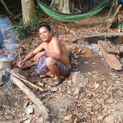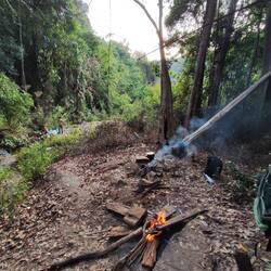 Es geht an die Essensvorbereitungen, 3 Feuer sollen für Teewasser, Hähnchengrill und Reistopf sorgen. Gemüse wird in einem dicken Bambusrohr im Feuer zum kochen gebracht.