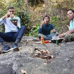 Glücklich nehmen wir auf den mit Wasser umspülten Felsen Platz und genießen das Essen und die neue Gesellschaft.
