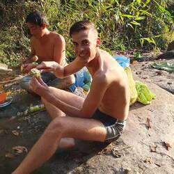 Gegen 16:30 Uhr erreichen wir unseren Übernachtungsplatz an einem Bach. Aus Bambusröhren fließt frisches Gebirgswasser, wir können uns nicht zurückhalten, die Dusche wäscht den Schweiß von unseren malträtierten Körpern...