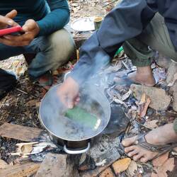 Frühstück im Dschungel. Das Wasser brodelt am Lagerfeuer, es gibt löslichen Kaffee (3 in 1 = Kaffee+Milch+Zucker). An süßen Kaffee haben wir uns inzwischen gewöhnt. Tee wird aufgebrüht und fürRead more