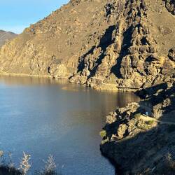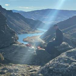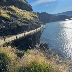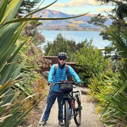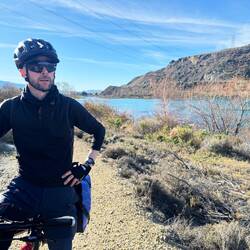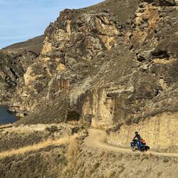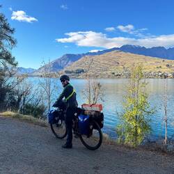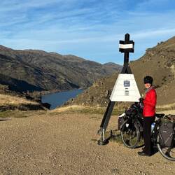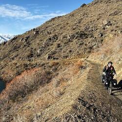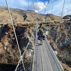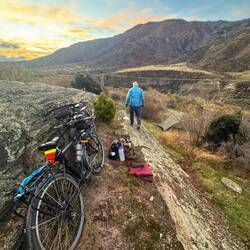 From our fab camp above the Gibbston River Trail we sped along HWY 6, trying to avoid a gazillion possum roadkills and some large trucks, onward towards the town of Cromwell. We had a break randomly at The Highlands Motorsport Park - the nearest cafe for breakfast. Here we met lovely Steph and Don (who both had just taken a very fast Lamborghini ride around the track). It was lovely to meet them and after ten mins chatting to us, they generously invited us to stay with them when we reach Wellington! We very much hope to take them up on their wonderful and very kind offer and will endeavour not to be too smelly 😊. Joining the Lake Dunstan Trail, we initially rode past vineyards, and then hugged the lakeside. Linking the heritage towns of Cromwell and Clyde, the trail witnesses land shaped by nature and also the gold miners and dam-builders who toiled along it during the last couple of hundred years. We rode along constructed clip-on boardwalks, an 86m suspension bridge, around craggy bluffs, past a floating boat cafe (!) sadly closed, and two very challenging switchback hills. One of which was called the Cairnmuir Ladder - grade 3 in mountain NZ biking parlance but much harder on bike weighing in at 28kg with 20+kg of kit strapped to it! Rising 130 vertical metres over several switch backs it was tough. Our camp at days end was beside the water, with some possums and two noisy feral pig visitors at night! 🫣😳 The wee pig was spotted on a moonlit walk and was bold as brass. Not bothered by our presence at all. The big one may have been its mum and sounded like a T-Rex. Although anything snuffling around outside a tent when you’re in it sounds large! 😆Read more