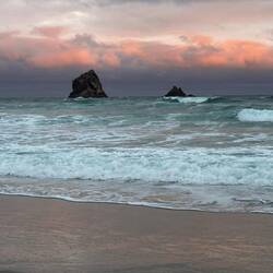Reluctantly leaving our coastal paradise (it was now past 2pm and we still had 20 miles to go) we climbed several hills - giving glimpses of sparkly ocean behind us - and arrived at inland Paringa Lake as chilly dusk fell. For once, we weren’t the only ones at the Department of Conservation campsite and it felt strange to hear human hubbub amongst the nightly nature sounds.Read more