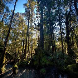 When the sandflies (like midges) drove us from the bright shore, we delved into the dark interior of a remnant swamp grove behind the beach. A different place of magic. In South Westland, one tree towers over all others - the kahikatea. NZ’s tallest tree, its straight distinctive silhouette reaches for the sky up to 65 metres above its buttressed roots, that interlock with their neighbours’ to hold themselves upright in the bog. Kahikatea swamp forests are now rare. Demand for timber and land for agriculture (largely dairy farms) have seen these forest giants hacked away and their wetlands drained. Their pale, odourless timbers were perfect for packaging butter and cheese as they did not taint or stain the produce, and from the early 1900s the ancient kahikatea trunks were fashioned into millions of crates to service dairy exports from New Zealand to Britain. By the late 1940s kahikatea covered areas had slid into mythical status.