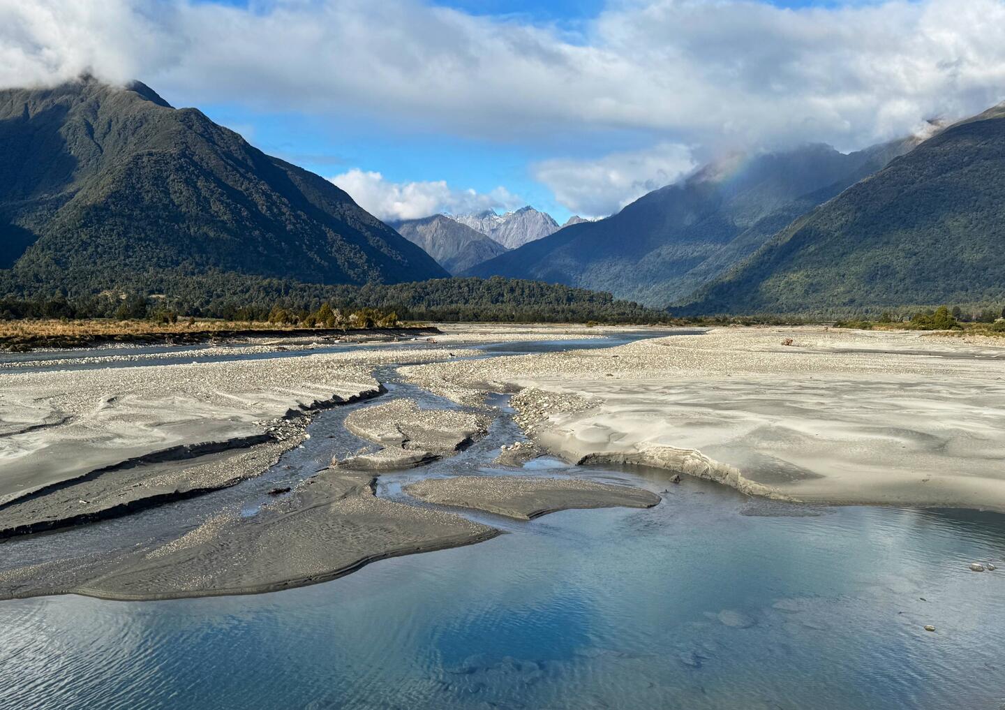 The landscape felt Jurassic and then majestic full-on LOTR as the glacial valley opened up, with the braided river bed a mile wide, coloured a rocky grey and a sight to see making a vast furrow that meets the Tasman Sea.