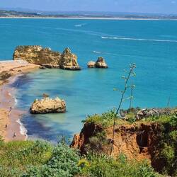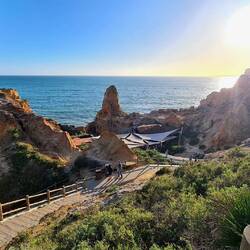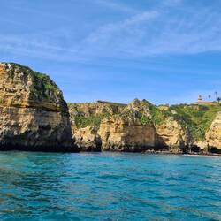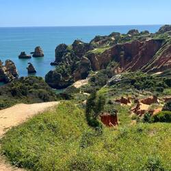 Was ich vorher nicht wusste, zwischen Lagos und Luz gibt es eine Steilküste, die es in sich hat. Entlang dieser Küste schlängelt sich ein Bretterpfad, der von Fahrradfahrern und Fußgängern gleichermaßen genutzt werden kann. Zum Glück gibt's nicht viele Amteurtouristen und wir kommen ohne ein böses Wort miteinander klar. Bebretterte Stichpfade führen uns zu den jeweiligen Aussichtspunkten. Was man dann sieht, da bleibt einem einfach die Spucke weg. Hier hat die Erosion durch Wellen und Wind ganze Arbeit geleistet. Braun, rot und gelb fällt diese Küste ins türkise Meer hinab. Riesige Stalagmiten erheben sich aus dem Meer. Einige klammern sich im oberen Bereich noch ans Festland und hoffen auf diese Weise nicht vom Meer und Wind gefressen zu werden. An anderen Stellen sieht man kreisrunde Löcher mit einem Durchmesser von 40 m, deren Grund man nur erahnen kann. Ich hab schon einige Bilder von Freunden gesehen, die zwei Wochen vor uns hier waren. Aber Original und Bild sind zweierlei Welten. Mit so etwas haben wir nicht gerechnet.