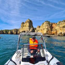 Mit 3 kn gings aus der Hafeneinfahrt in den Atlantik. Hebel nach vorne, ein kurzes Aufkreischen und ab gings von Welle zu Welle zu der zerklüfteten Küste, die wir zuvor vom Land her besichtigt hatten. Es war Ebbe und die gewaltigen Stalagniten stellten ihre imposante Größe zur Schau. Rot, gelb erhoben sie sich aus dem blauen Meer. Langsam, ganz langsam tuckerten wir zu ihnen und an ihnen vorbei. Grosse Höhlen kamen zum Vorschein, in denen ich mich nicht hineintraute, da der Wellengang doch zu groß war. Riesige Torbögen verbanden einzelne dieser Giganten. Anderthalb Stunden gings entlang dieser Kulisse.