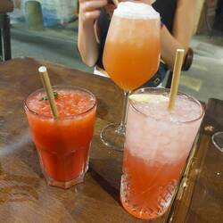 Heute haben wir erst die Pink Street und dann die Green Street besucht. Dann haben wir einem ruhigen Nachmittag im Hostel gemacht. Abends sind wir ins Barviertel gefahren. Dort waren wir zuerst in einer Ginbar, die uns Friedas Onkel Christian empfohlen hat und haben Gin aus Schokobechern getrunken, bei denen man einen kostenlosen Refill bekommt, wenn man den Schokobecher nach dem ersten Trinken nicht isst. Nach dem Refill haben wir ihn natürlich trotzdem gegessen. Dann haben wir einen Sardinenladen gefunden, wo es Sardinen von 1916 bis heute gab. Als wir weitergelaufen sind, sind wir an einem Straßenmusiker vorbeigekommen, bei dem eine total coole Stimmung war und alle Zuschauer mitgesungen und getanzt haben. Als wir dann in eine Bar gegangen sind, haben Frieda und Maria Caipiblack und Caipiblue getrunken (ratet mal, wer was getrunken hat!).