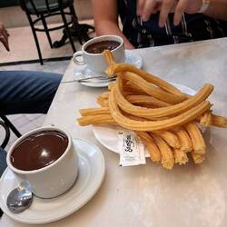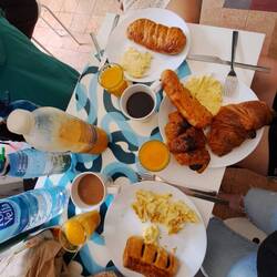 Unser Zug Richtung Madrid ist um 8 Uhr gefahren. Zuerst lief auch alles super, doch dann hatte der 2. Zug Verspätung, wodurch unser Plan B ins Wasser gefallen ist. Endlich angekommen in Badajoz wurde uns gesagt dass die komplette 2. Klasse nach Madrid schon ausgebucht ist. Entweder wir schlafen eine Nacht in Badajoz obwohl das Hostel in Madrid schon gebucht ist und fahren am nächsten Tag weiter oder wir kaufen ein 1. Klasse Ticket für sage und schreibe 87€. Nach kurzer Überlegung haben wir uns für das teure Ticket entschieden, um unsere Zeit in Madrid nicht "zu verschwenden". Als wir in den Zug gestiegen sind wurden wir jedoch sehr enttäuscht von der 1. Klasse. Naja, jedenfalls haben wir es dann endlich nach Madrid geschafft. Unser Hostel ist sehr schön und hat gratis Kaffee und Churros Morgens.