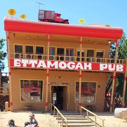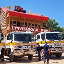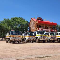 While there, I suggested we make a very brief stop at the Ettamogah Pub, line up the trucks and get a photo of them in front of the pub. I asked our IC if we could, and he was indifferent but told me to talk to the drivers and see what they want to do. 3 were indifferent, 4 were ok with the stops and none of them were opposed to it, so as we approached Table Top we pulled off the highway, got the trucks lined up and got the photo. An awesome outcome and a famous Australian icon; a typically Australian scene and opportunity not to pass up.