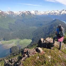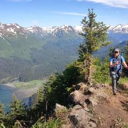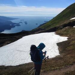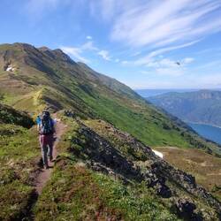 Am besten kann man die Wanderung über die Grace Ridge von Süden nach Norden traversieren. Wir buchten uns also ein Wassertaxi für 14:15, dass uns vom Homer Spit zum Startpunkt des Trails bringen soll. Die Fahrt mit dem Wassertaxi dauerte zirka 45 Minuten. Dort angekommen landete das Boot direkt an den Strand an und wir durften über eine Leiter vom Boot abklettern. Der Bootsmotor heulte auf, es drehte sich rasch um die eigene Achse und schon war das Boot auch schon wieder verschwunden. Auf der sehenswerten Fahrt erzählte uns der Kapitän, dass er sehr gerne wandert und die Grace Ridge eines seiner liebsten Gebiete sei um diesem Hobby nachzugehen und um eine entspannte Zeit zu verbringen. Ausgezeichnete Wahl haben wir da getroffen, dachten wir uns! Die Rückfahrt mit dem Boot ist erst für morgen um 15:15 geplant, denn Jutta und ich haben unser Zelt, die Schlafsäcke und jede Menge Essen und Trinken dabei, um eine herrliche Nacht am Gipfel der Grace Ridge zu verbringen und morgen gegen Mittag erst wieder absteigen zu müssen.