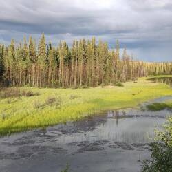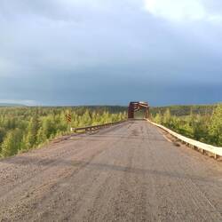 Nachdem wir nun auch einen langen Rückweg bis nach Dawson City haben, müssen wir unsere Fahrt heute fortsetzen. 740km Fahrt liegen vor uns. Wir hätten nicht gedacht, dass dieser Trip in den Norden so fordernd sein wird. Teilweise mussten wir bei der Rückfahrt die Geschwindigkeit auf 30-40km/h reduzieren und selbst dann schaukelte es wild hin und her. Bei Gegenverkehr fuhren wir oft rechts an den Rand, damit die Steine, die im Hohen Bogen durch die Luft fliegen nicht unsere Windschutzscheibe zerstören. Später passiert dann aber das Unvermeidliche. Ein Stein erwischt uns und wir haben erneut einen Steinschlag auf der Windschutzscheibe. Und dies sollte nicht der letze sein. In Whitehorse müssen wir wohl wieder eine Werkstatt aufsuchen.