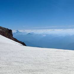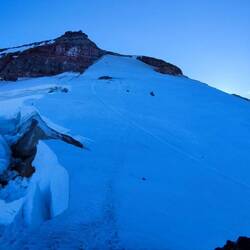 Um 1 Uhr klingelt der Wecker. Müde kriechen wir aus den Schlafsäcken und dem Zelt. Wir sind schnell abmarschbereit, aber die Gruppe, der wir ja hinterher gehen wollen braucht eine gefühlte Ewigkeit. Erst um halb 3 geht es endlich los. Nach 10 min sind wir an der ersten Wand. Zum Glück sehe ich in der Finsternis nicht wie steil diese ist, aber Michi hat sich den Weg schon am Vortag angesehen. Die Wand ist normalerweise nicht so steil, weil sonst mehr Schnee liegt. Heuer, vor allem am Ende der Saison ist der ganze Schnee schon weg und deshalb ist es jetzt so steil und vor allem ist hier jede Menge Blankeis, juhu. Das heißt wir müssen uns mit Eisschrauben mühsam hochsichern. ein wenig mühsam ist auch, dass sich am ganzen Berg keine einzige Markierung befindet bzw keine einzige Spurt am Gletscher zu finden ist. Da die Gruppe aber vor uns so lange braucht haben wir ja genug Zeit um gute Stände zu bauen. Immer wieder müssen wir warten bis die Gruppe fertig ist. Normalerweise machen wir das nicht so, aber da die Verhältnisse bereits so schlecht sind gehen wir lieber auf Nummer sicher und bleiben hinter der Gruppe und lassen ortskundige Bergführer voraus gehen. Sich einen Berg hoch zu warten ist normalerweise nicht unser Bergsteigerstil, manchmal gehts leider nicht anders. Als wir dann auf dem Gletscher sind wollen wir das erste Mal überholen, weil wirklich nichts weiter geht. Kurz darauf sehen wir, dass wir keinen guten Weg gewählt haben und die Gruppe einen anderen Weg über die Spalten nimmt, deshalb drehen wir wieder um und bleiben noch einmal hinten. Erst hoch oben am Sattel überholen wir dann. Es geht nun ein Stück auf einem breiten Grat hoch und dann kommt noch einmal eine extrem steile und hart gefrorene Gipfelwand, die Roman Wall. Wieder müssen wir sichern und das dauert mit dem 30m Seil ziemlich lange. Oben angekommen ist es gar nicht so leicht über den Schrund drüber zu kommen. Das Gestein ist sehr brüchig und es ist sehr viel Blankeis darunter. Endlich sind wir über dem Schrund und jetzt trennen uns nur noch ein paar hundert Meter vom Gipfel, die wir am relativ flachen Gipfelplateau schnell zurück legen können. Wir sind die einzigen am Gipfel. Oben weht ein eiskalter, starker Wind und wir bleiben nicht lange. Es ist noch ein langer Abstieg bis zum Zeltplatz und deshalb schauen wir, dass wir zügig weiterkommen. Am Schrund angekommen sehen wir die 5 köpfige Gruppe. Sie kämpfen sich grad das Steilstück hoch. Der Bergführer beschließt aber, dass am Bergschrund für die Gruppe heute Schluss ist, denn seine Gäste sind leider seit Stunden etwas über dem Konditionslimit unterwegs und auch auf sie wartet noch ein langer Abstieg. Somit waren Michi und ich die Einzigen, die von dieser Seite aus heute den Gipfel erreicht haben.