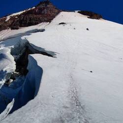 Der Abstieg über das erste Steilstück ist genauso mühsam wie der Aufstieg. Wir kommen nur sehr langsam voran, weil wir viel sichern mussten und sind dann schlussendlich sehr froh, als wir endlich unten am Gletscher sind. Der erste Teil des Gletschers hat noch viel Schnee und man kommt gut über die Spalten. Weiter unten werden die Spalten mehr, aber auch hier geht es gut. Interessant ist, dass wegen der mittlerweile sehr starken Sonneneinstrahlung keine Aufstiegsspuren von uns mehr sichtbar sind und wir nun mit gps navigieren müssen um durch das Spaltenlabyrinth zu finden. Am Ende kommt noch das letze Steilstück und das ist dann der mühsamste Teil der Tour. Die Steilheit, das Blankeis und die Spalten machen es uns schwer einen guten Weg zu finden. Am Ende waren wir gesamt 14h unterwegs. Das Warten auf die Gruppe und die schwierigen Passagen haben viel Zeit gekostet. Eigentlich wollten wir ja noch bis zum Auto absteigen. Aber nach dieser langen Tour (1600hm - fast wie daheim der Glockner als Tagestour) beschließen wir noch eine weitere Nacht im Camp zu verbringen. Wasser haben wir dank der vielen Gletscherbäche mehr als genug. Nur das Essen wird schon knapp, bis morgen reicht es aber gerade noch. Ein wenig fasten schadet uns nicht, obwohl der Hunger groß wäre. Michi hat auf der heutigen Tour laut seiner Suunto Uhr 4500kcal verbraucht, dazu noch 2000kcal Grundumsatz. Wir teilen uns ein Päckchen Instantnudeln mit ca 550kcal und sind fast satt. 😃
