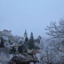 So kommt es, dass wir knapp sechs Stunden später nicht im T-Shirt in der Sonne sitzen, sondern mit den dicken Jacken durch eine Rauhreiflandschaft spazieren. Wir finden's lustig.