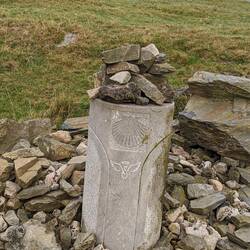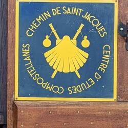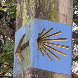 Now we've become a trio of pilgrims. Michaela, a woman from Berlin Germany, has joined us for our walk. I stopped to pose at the ionic Roncesvalles to Santiago de Compostela sign with its 790Read more
