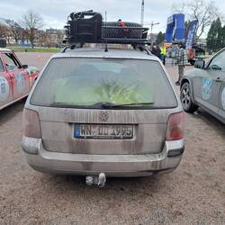 Und auch ein Foto von unserem ramponierten, aber sehr gut funktionierenden Rally-Passat. So sieht ein Auto nach etwa 3000km durch das winterlicheLes mer