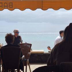 Der starke Wind heute erfordert Pulli und Jeans beim Frühstück. Beim Spaziergang am Meer tun Kopftuch für mich und Weste für Michael gute Dienste. Der Rückweg zum Hotel verpasst uns einLæs mere