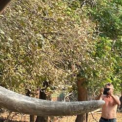 Um Gottes Willen, das sind keine Tücher, das sind OHREN!! Da steht ein ausgewachsener Elefantenbulle vor meinem Küchenfenster und wackelt mit seinen Riesenohren.