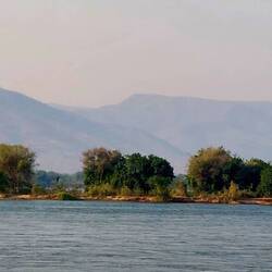 Was für ein Anblick, was für ein gigantischer Fluss mit großen Sandbänken, raschelndem Schilfbewuchs und den Sambischen Bergen im Hintergrund.