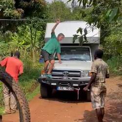 An einer Stelle hängen irgendwelche Kabel so tief, dass wir mit unserem hohen Auto nicht darunter her passen. Kai muss - einem Akrobaten gleich - auf unserer Motorhaube balancieren, um das Kabelgewirr hoch zu halten, ein paar Einheimische helfen mit langen Ästen und Stöcken.