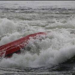 Unser Boot und mit ihm 4 crazy Hohmeiers, der dämliche Schachtelhuber und der brüllende Steuermann kippt um, und wir überschlagen uns unkontrolliert.