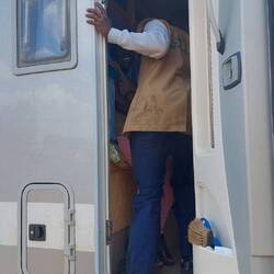 Vor dem Auto bilden sie ganz diszipliniert eine lange Schlange, und Viktor lässt immer zwei gleichzeitig hinein. Für mehr ist kein Platz. Geduldig warten alle, bis auch der letzte unser Haus bestaunt und auf der Sitzbank Probe gesessen hat.