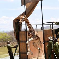 Tierschützer aus aller Welt reisten nach Kenia: Eigens für die Rettung bauten sie ein riesiges Floß, auf dem die Giraffen zum Festland transportiert wurden.