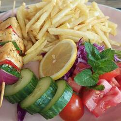 Im Café von Tessa genießen wir ein Lunch bestehend aus real German Sausages für Kai und Karola, einen Quinoa Salat vom Feinsten für Viktor und ich bekomme einen köstlichen Halloumi - Käse - Spieß vom Grill.... und das alles im tiefsten Afrika.