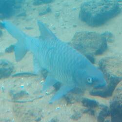 Die Scheiben sind zwar voller Algen und teilweise mit Sprüngen versehen, doch erspähen wir von hier unten den ein oder anderen Fisch, vorwiegend fette Karpfen.