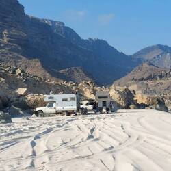 Nun sitzen wir hier am Fazayah Beach, südwestlich von Salalah.