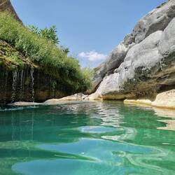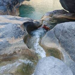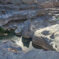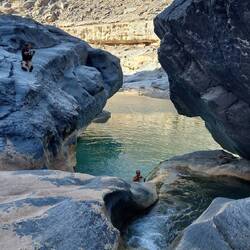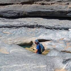 Das Wadi beginnt ziemlich genau hinter einem kleinen Damm mit vielen großen glatten Felsen, die man auf irgendeine Art und Weise überwinden muss: springend, rutschend, kletternd oder auf allen Vieren kriechend.