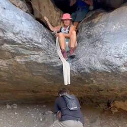 Als die Beiden uns eine Stunde später auf dem höchsten Felsen thronen sehen, sind ihre Augen groß wie Suppenschüsseln. Das muss eine Fata Morgana sein. Diese Tarzans und Janes auf den Felsen können unmöglich wir sein.
