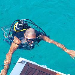 Aber ein erfahrener Skipper hat für jeden Notfall etwas an Bord. Pit schnallt sich seine Scuba Diving Ausrüstung auf den Buckel und stürzt sich rückwärts von der Reling ins Wasser ....nahezu filmreif.