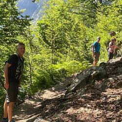 Der urwüchsige Pfad verlangt uns einiges ab: Wir steigen fast stetig bergauf über Wurzeln und Felsen.