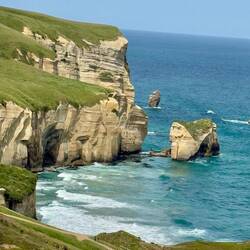 Über Jahrhunderte hinweg haben der Wind und der rauhe Ozean die Sandsteinklippen südlich von Dunedin bearbeitet. Entstanden sind schroffe Abhänge, Felsbögen und Landspitzen, die eine atemberaubende Kulisse bereitstellen.