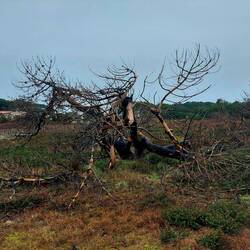 Die bizarre Atmosphäre wird nicht nur durch das trübe Wetter, sondern auch durch die geisterhaft wirkenden Reste des Kiefernwaldes verstärkt. In den vergangenen Jahren gab es hier etliche Brände entlang der Küste. Die zurück gebliebenen schwarzen Baumskelette wirken gespenstisch und wie aus einer anderen Welt.Meer informatie