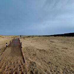 Rund 2,9 km lang, ca. 600 m breit und zwischen 100 und 118 m hoch – so ganz genau kann die Zahlen niemand benennen, denn die Dune du Pilat ist einem ständigen Wandel unterlegen. 55 Millionen Kubikmeter Sand werden vom Wind beständig in Bewegung gehalten, formen Wellenberge und -täler und wirken trotz ihrer unvorstellbaren Masse leicht. Vielleicht liegt das auch an dem feinen Sandschleier, der über die Oberfläche weht und die Konturen ein wenig verschwimmen lässt.