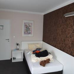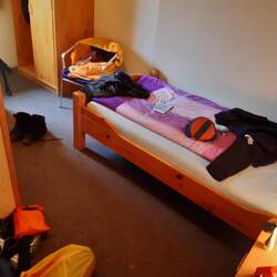 Ankunft in Scheid, statt Zelt lieber Pension. Abends schön Pizza essen.