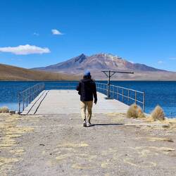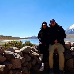 Nuestra primera noche en Putre fue muy fría (nuestra calefacción no funcionaba bien de alguna manera), pero el desayuno nos fortaleció de nuevo antes de continuar nuestro recorrido a las 09:00. Poco después de salir hacia el Parque Nacional Lauca, vimos nuestras primeras llamas. 🦙 Continuamos hacia Las Cuevas en el Parque Nacional (un pequeño sendero que alberga, entre otras cosas, rocas que sirvieron como asentamientos de cazadores hace miles de años), donde vimos muchas vizcachas y vicuñas. 😍 Después de esta corta caminata a 4'400 m.s.n.m., continuamos a un sitio arqueológico llamado Chacu, que estaba un poco fuera del camino principal. El sitio se utilizaba para recolectar animales como llamas y alpacas. De vuelta a la carretera principal, Álvaro nos llevó hasta un mirador sobre las hermosas lagunas de Cotacotani, que abandonamos de nuevo tras una breve parada para dirigirnos a nuestro principal destino del día, el Lago Chungara. El lago es uno de los más altos (4'566 m.s.n.m. según Wikipedia) del mundo. El cercano volcán Parinacota y los animales pastando alrededor de la orilla le dan al lago un atractivo adicional.