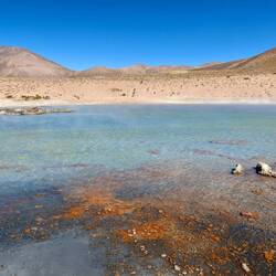 Tras el buen almuerzo, continuamos a lo largo del lago (donde de hecho vimos un ñandú desde lejos) hasta las Termas de Polloquere, donde decidimos no darnos un baño en el agua caliente debido a la baja temperatura exterior. Poco después, nos esperaba un viaje más largo, en el que también alcanzaríamos el punto más alto de este viaje. Afortunadamente, sólo era un paso y dejamos los 4.700 m de altitud bastante rápido. Tras unas breves paradas, nos dirigimos hacia el Parque Nacional Volcán Isluga, que atravesamos en su mayor parte conduciendo. Al pasar junto a las innumerables llamas y alpacas, Álvaro tuvo la amabilidad de conducir muy despacio o detenerse brevemente para que pudiéramos sacar algunas fotos graciosas y divertidas. Finalmente, continuamos hasta Colchane, donde llegamos de nuevo a una carretera asfaltada (el cambio de coche del monovolumen a una camioneta 4x4 algo más incómoda iba a merecer la pena debido a las condiciones de la carretera). Al poco tiempo de registrarse, pronto hubo otra rica cena y a pesar de la altitud de 3.700 m.s.n.m. nos deleitamos con una copa de vino para brindar con Álvaro por el pronto final del tour.