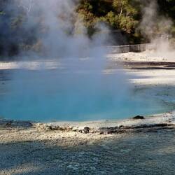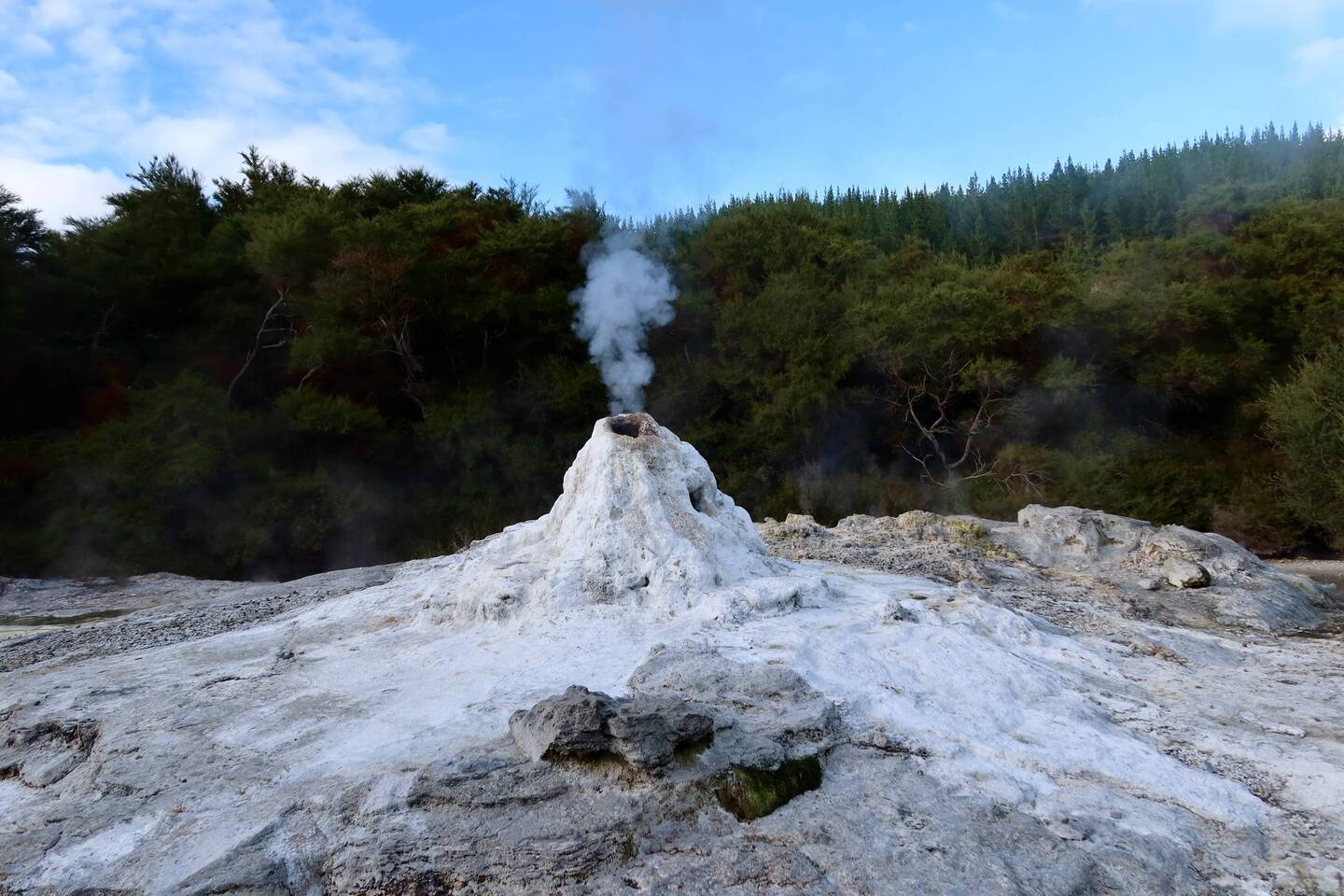 Heute morgen holten wir dann Verpasstes dennoch nach. So fuhren wir noch einmal ein Stück zurück nach Wai-O-Tapu ins Thermal Wonderland. Da beim ersten Stopp, dem Lady Knox Geyser, keine Tickets gekauft werden können (resp. nur Online-Tickets) musste dann ein wenig Datenvolumen und viel Geduld (mit der dritten Kreditkarte funktionierte die Bezahlung) gebraucht werden, um unseren Eintritt zu sichern. Wie für uns begann die Besichtigung des Parks wohl auch für alle anderen Besuchenden um 10.15 Uhr, wenn der (künstlich angelegte!) Lady Knox Geyser mit einer „Tablette“ aus Seife gefüttert und kurze Zeit später aktiv wird. Irgendwie komisch, dieser künstlich erzeugten Zeremonie beizuwohnen, andererseits dennoch sehr imposant wie der Geyser heisses Wasser ausstösst. Nach einigen Minuten Spektakel ging es dann (auch gezwungenermassen, da die Zugangsstrasse zum Geyser wieder geschlossen wird) in Richtung Visitor Centre, wo wir uns im Café kurz mit einem warmen Getränk stärkten (schlauer Schachzug, da wir so den Menschenmassen grösstenteils entgehen konnten). Vom Café aus ging es dann durch den eigentlichen Besucherpark, wo wiederum diverse Hot Pools etc. besichtigt werden konnten. Klares Highlight auf dem rund 1.5-stündigen Rundweg: der Champagne Pool. Leider dampfte es etwas gar stark, sodass die wunderprächtigen Farben nicht immer und überall zu sehen waren. Nach der Absolvierung des Weges ging es zur letzten Attraktion im Thermal Village, den Mud Pools. Hatten wir bei den anderen Attraktionen auch immer wieder Mud Pools gesehen, so waren diese heute doch mit Abstand die spektakulärsten, da im Vergleich zu den anderen sehr aktiv und stark blubbernd (💩). Für uns war dies ein guter Abschluss dieser Art von Attraktionen, denn obwohl immer etwas Neues und Spannendes dabei war, hatten wir in den letzten Tagen doch genügend heisse Quellen etc. gesehen.