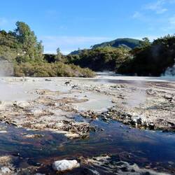 Um unsere Zeit in Taupo gebührend abzuschliessen, ging es heute morgen im herzigen Städtchen zu einem feinen Brunch in einem sehr beliebten Café. Nach dieser Stärkung fuhren wir noch kurz in Richtung Spa Thermal Park, von wo aus wir einige Minuten zum Waikato River liefen. Der Ort dort ist nicht zwingend wegen dem Abfluss des Lake Taupo spannend, sondern vielmehr wegen dem kleineren Otumuheke Stream, welcher in den Fluss fliesst. Dieser Zufluss bringt nämlich heisses Wasser und so bilden sich bei dessen Mündung die sogenannten Otumuheke Stream Hot Pools. Zum Baden war uns ohnehin nicht zumute, aber wir waren etwas überrascht als wir die Wassertemperatur fühlten. Denn das Wasser war höchstens lauwarm. Nichtsdestotrotz war auch dieser Ausflug spannend und wir konnten Taupo mit gutem Gewissen verlassen.