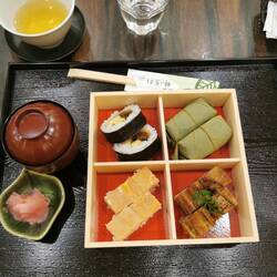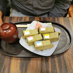 Leckeres Mittagessen mit Sushi, die in Kakiblätter eingewickelt sind, typisch für Nara.