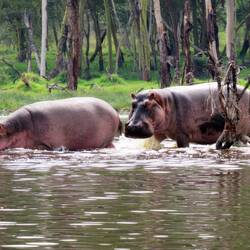 This lake is know for flamingoes and there were certainly a number of them but they were hard to get close to and hard to photograph. The bonus while we were watching the flamingoes were a pair of hippos coming back into the water after feeding. Such beautiful big creatures, supposedly one of the most dangerous in Africa although they don’t look it.