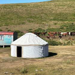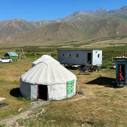 Auf dem Weg zum Flughafen sind wir diese Strecke schon in die andere Richtung gefahren. Jetzt scheint die Sonne und das Tien Shan Gebirge zeigt sich in ganzer Schönheit. Jurten, Jurten, Jurten amLeer más